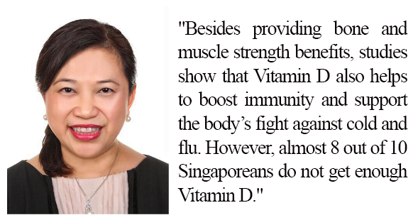 "Besides providing bone and muscle strength benefits, studies show that Vitamin D also helps to boost immunity and support the body’s fight against cold and flu. However, almost 8 out of 10 Singaporeans do not get enough Vitamin D", says Dr Angela Cheong, a family physician from Cheong Clinic.